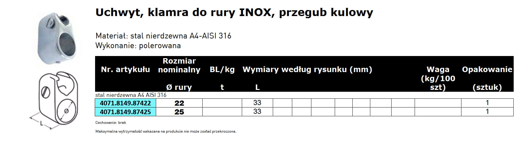 Klamra, obejma do rury INOX wzmocniona, widełki, uchwyt poręczy, barierki, balustrady, relingu