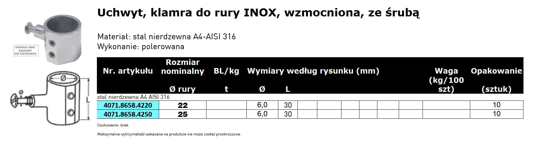 Klamra, obejma do rury INOX wzmocniona, widełki, uchwyt poręczy, barierki, balustrady, relingu