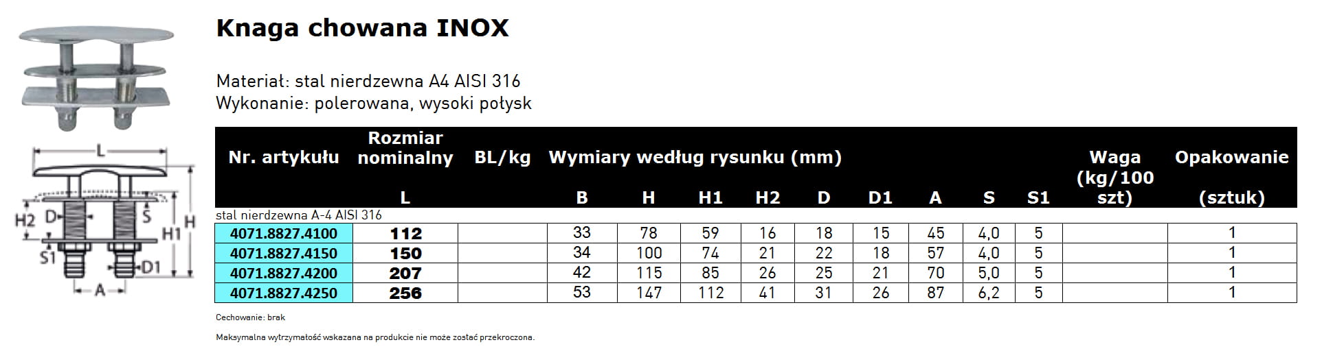 • Materiał: stal nierdzewna A4 AISI-316