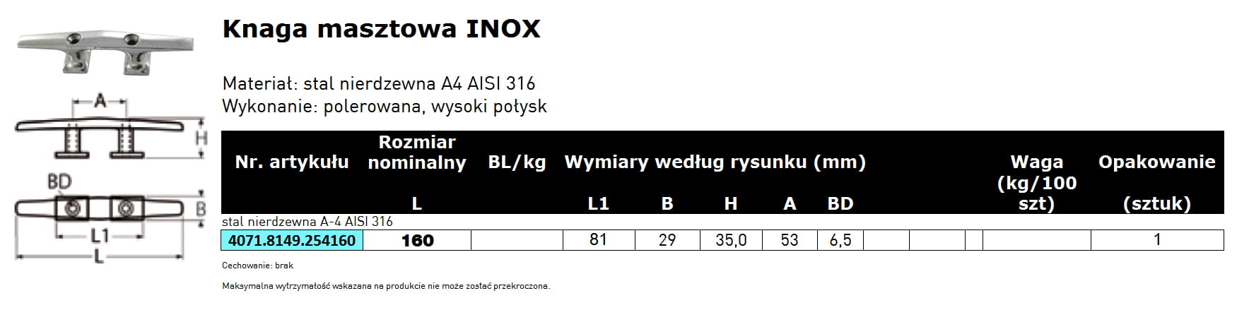 Knaga masztowa płaska, INOX A4, cztery otwory montażowe