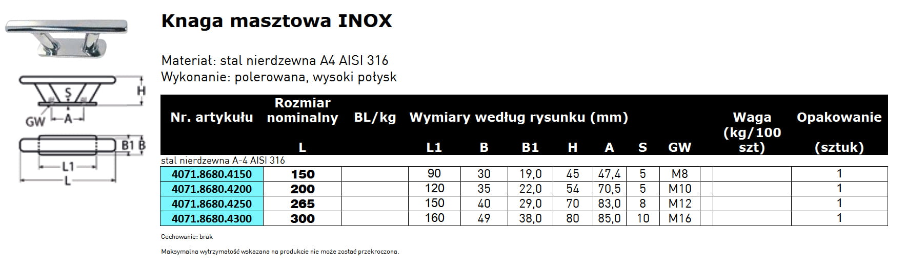 Knaga - Poler cumowniczy INOX A4, dwa otwory montażowe, gwint wewnętrzny