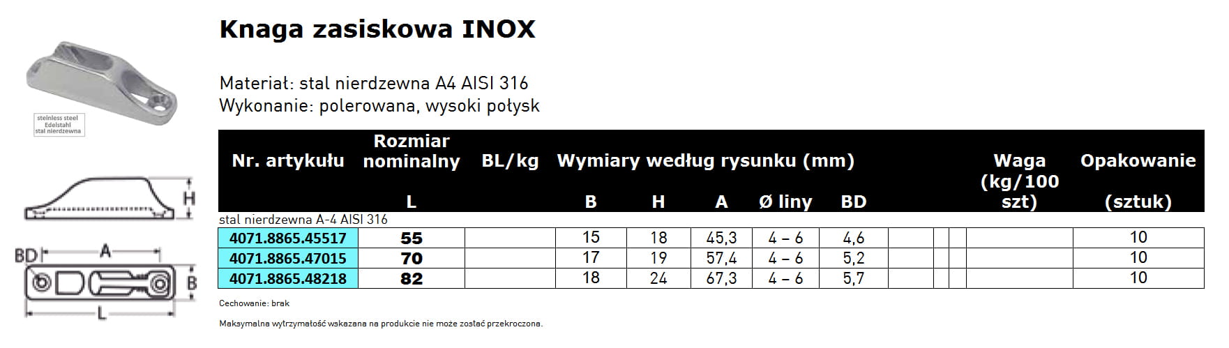 • Materiał: stal nierdzewna A4 AISI-316