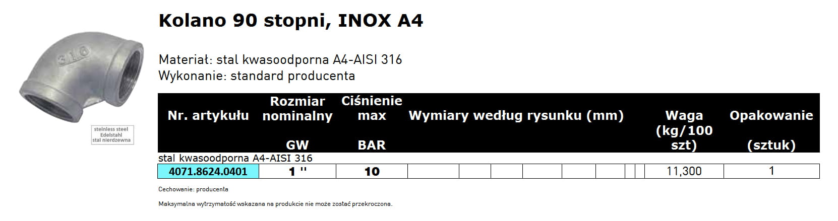 stal kwasoodporna A4 / AISI 316 - 3/8 cala, 1/2 cala, 3/4 cala, 1 cal, 1 1/4 cala, 1 1/2 cala, 2 cale