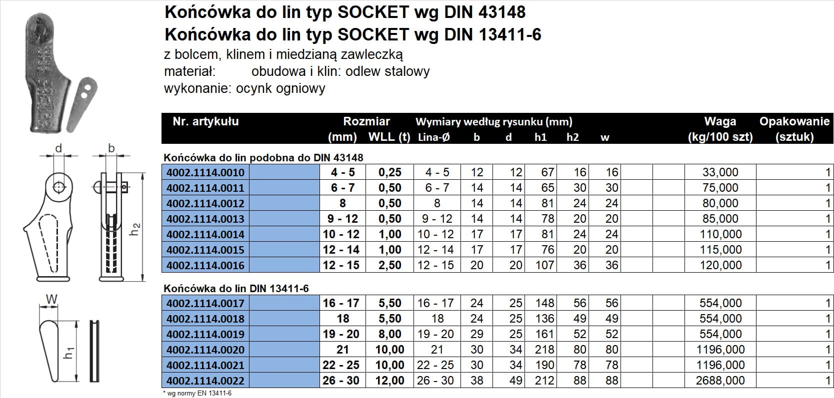końcówka do lin typ SOCKET wg DIN EN 13411-6 oraz symetryczna końcówka do lin typ SOCKET podobna do DIN 43148