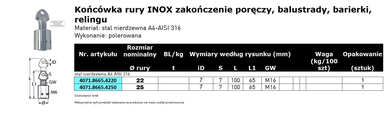 Końcówka rury INOX, zakończenie poręczy, balustrady, barierki, relingu, wzmocnione