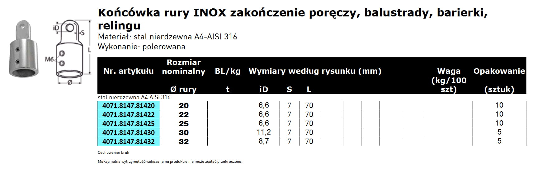 Końcówka rury INOX, zakończenie poręczy, balustrady, barierki, relingu, wzmocnione
