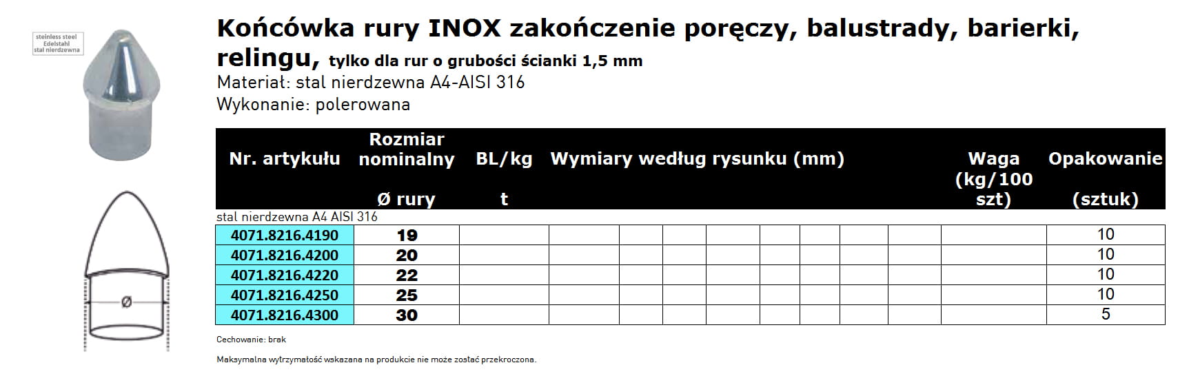 Końcówka rury INOX, zakończenie poręczy, balustrady, barierki, relingu, wzmocnione