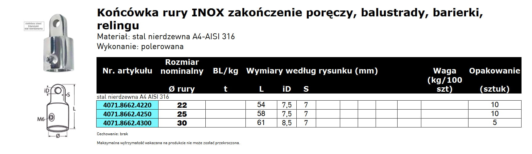 stal kwasoodporna A4-AISI316, polerowana, element balustrad, barierek, relingów, poręczy