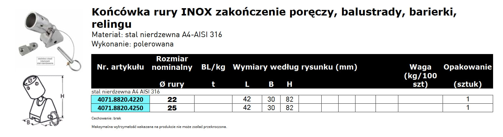 Końcówka rury INOX, zakończenie poręczy, balustrady, barierki, relingu, wzmocnione