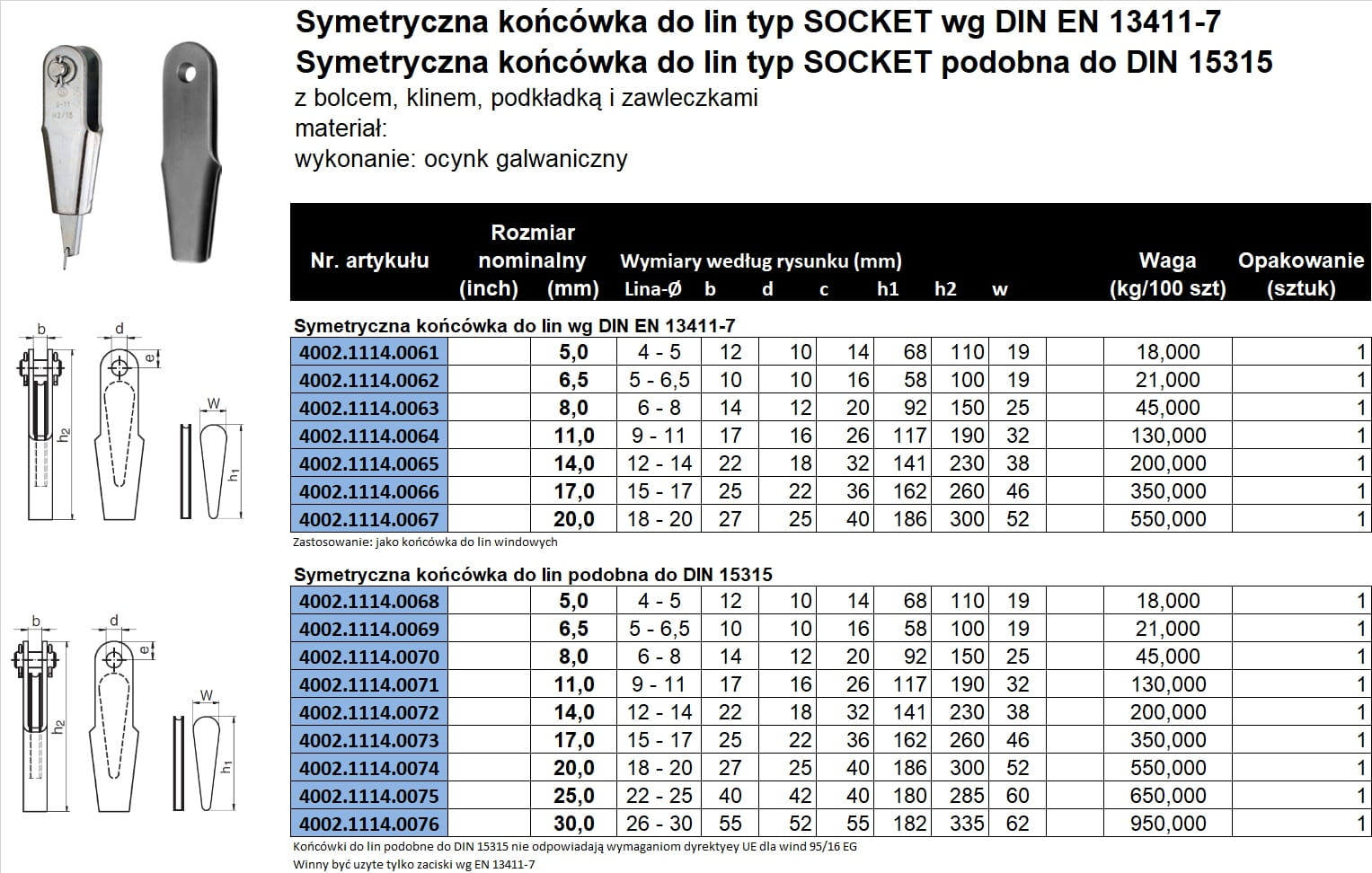 Symetryczna końcówka do lin typ SOCKET wg DIN EN 13411-7 oraz symetryczna końcówka do lin typ SOCKET podobna do DIN 15315