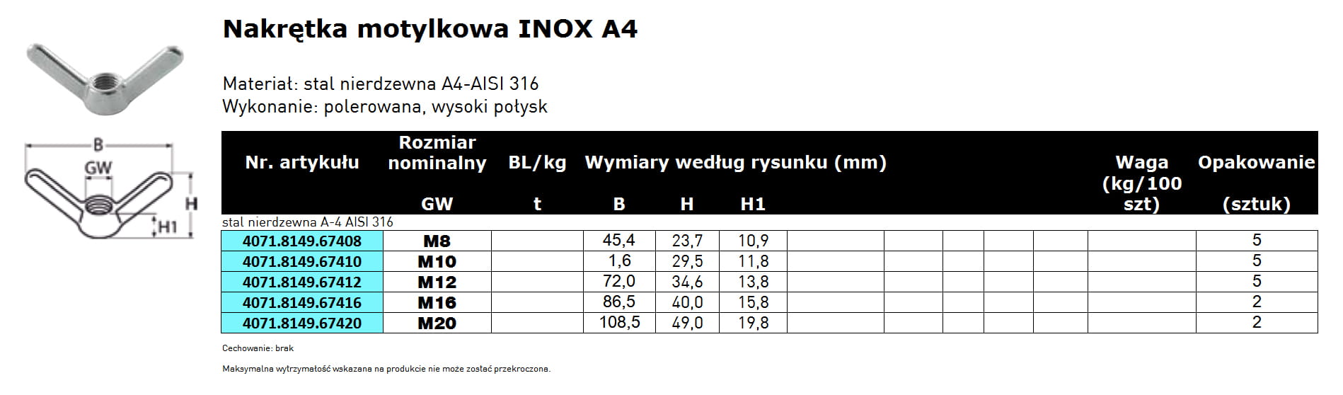 Nakrętka motylkowa nierdzewna, kwasoodporna, INOX A4