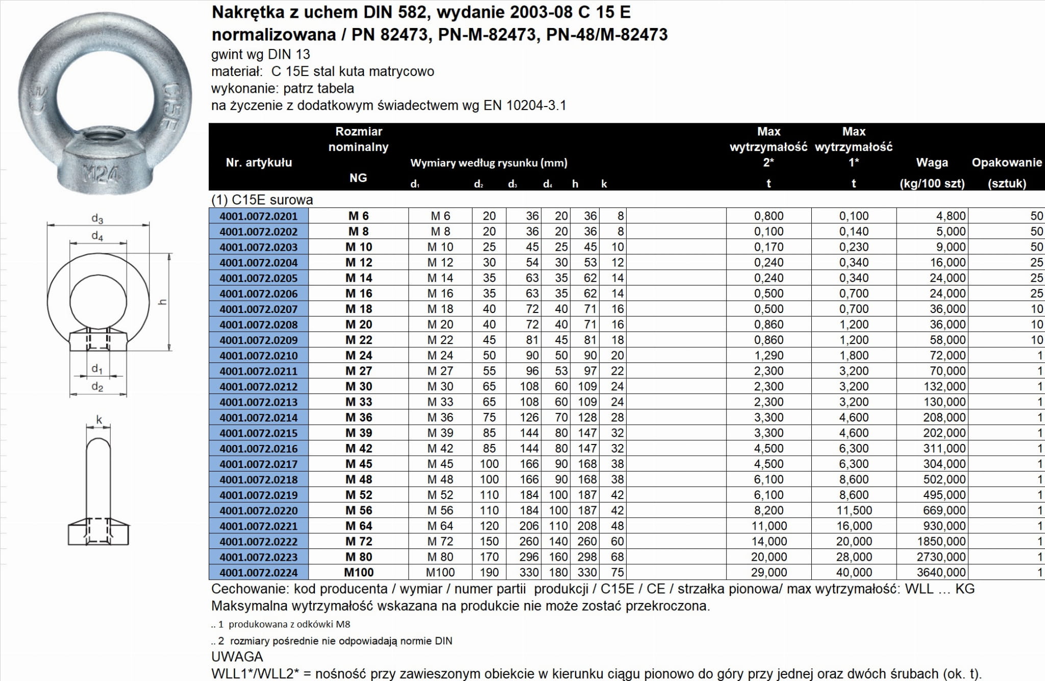 materiał C15E, zgodna z norma DIN 580, ocynk ogniowy HDG (tZn)