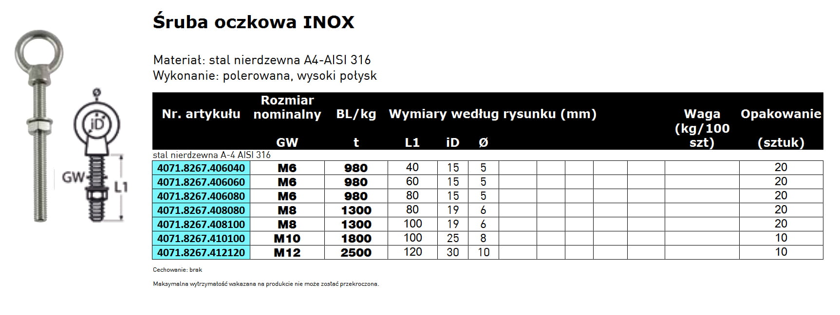 Śruba oczkowa, oko z gwintem zewnętrznym metrycznym, INOX A4