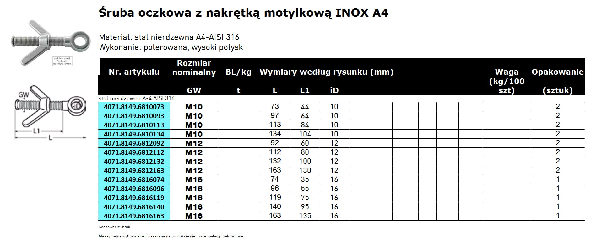 Śruba oczkowa, nierdzewna, z nakrętką motylkową zabezpieczoną przed spadaniem, INOX A4