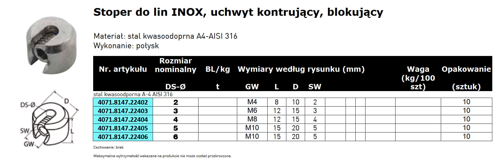 Stoper do lin INOX, uchwyt kontrujący, blokujący