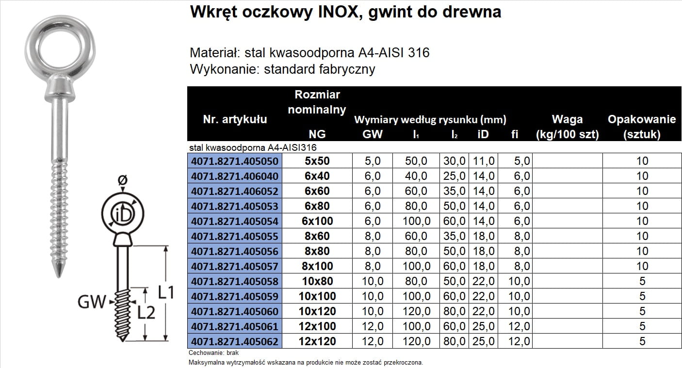 Wkręt oczkowy, oko wkręcane nierdzewne, gwint do drewna, INOX A4