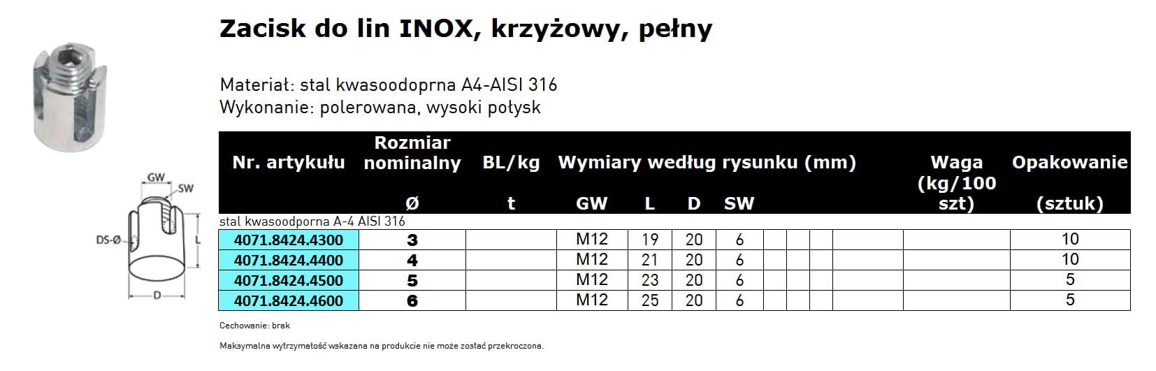 Zacisk do lin INOX, krzyżowy, pełny stal nierdzewna