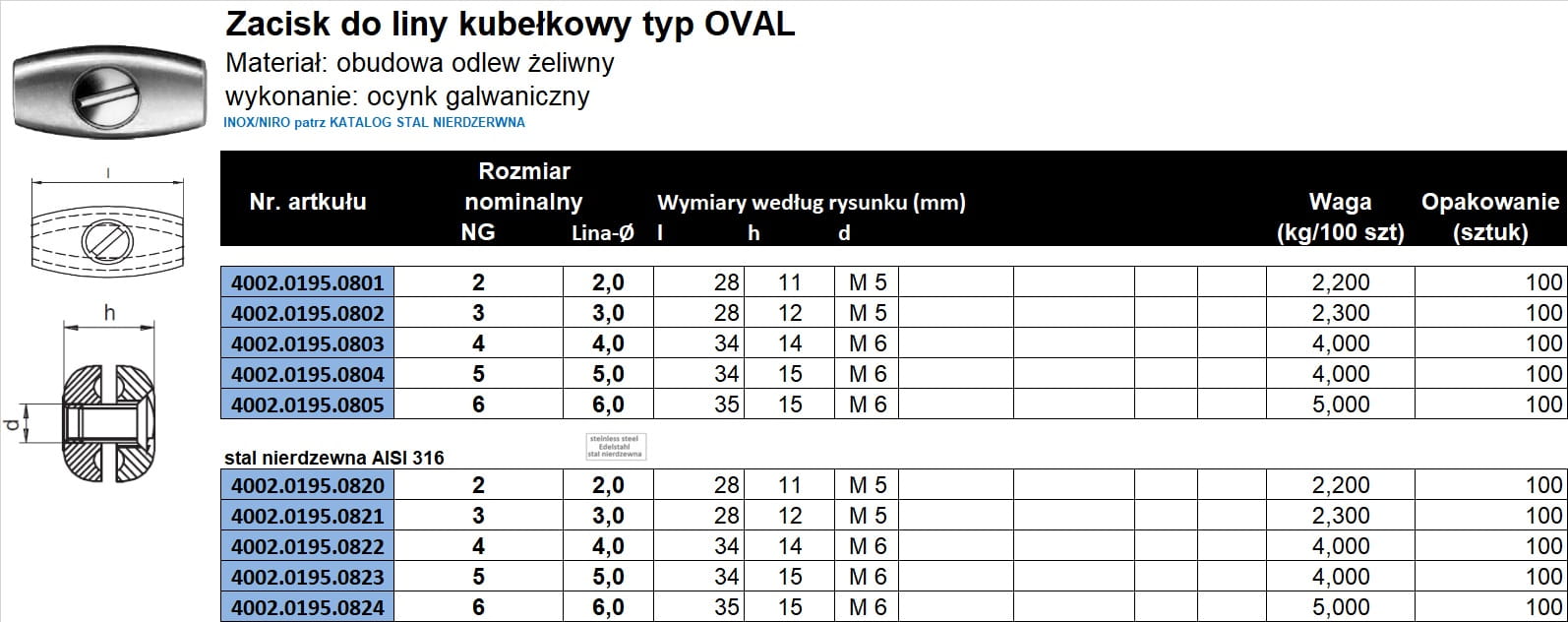 Zacisk kubełkowy do lin typ OVAL, ocynk galwaniczny