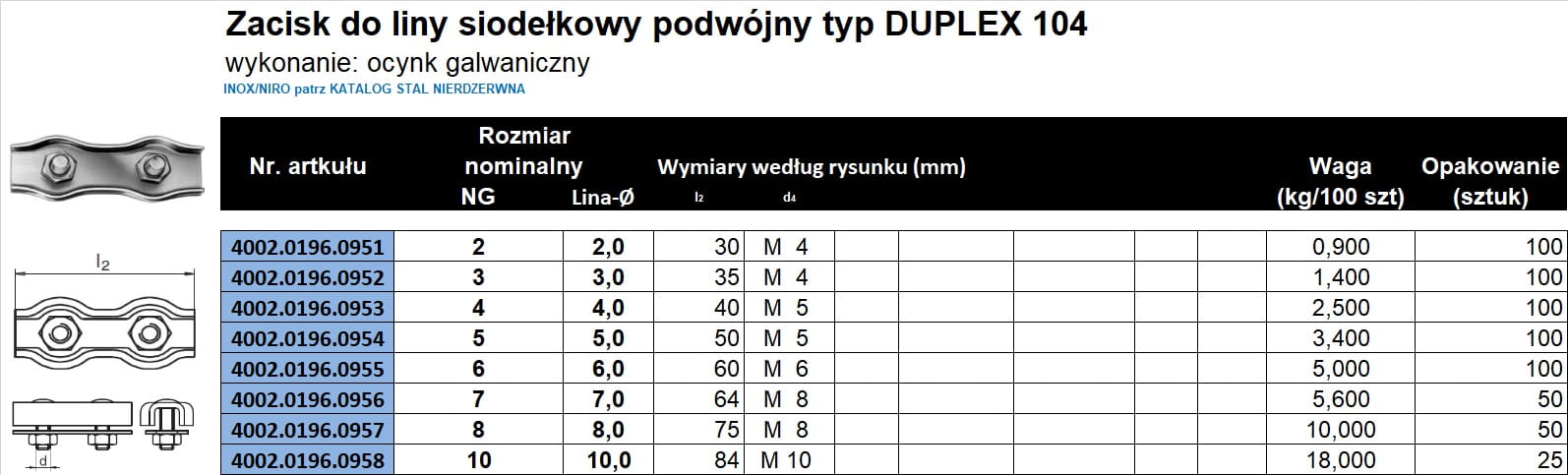 Zacisk siodełkowy do lin podówjny typ DUPLEX 104, ocynk galwaniczny
